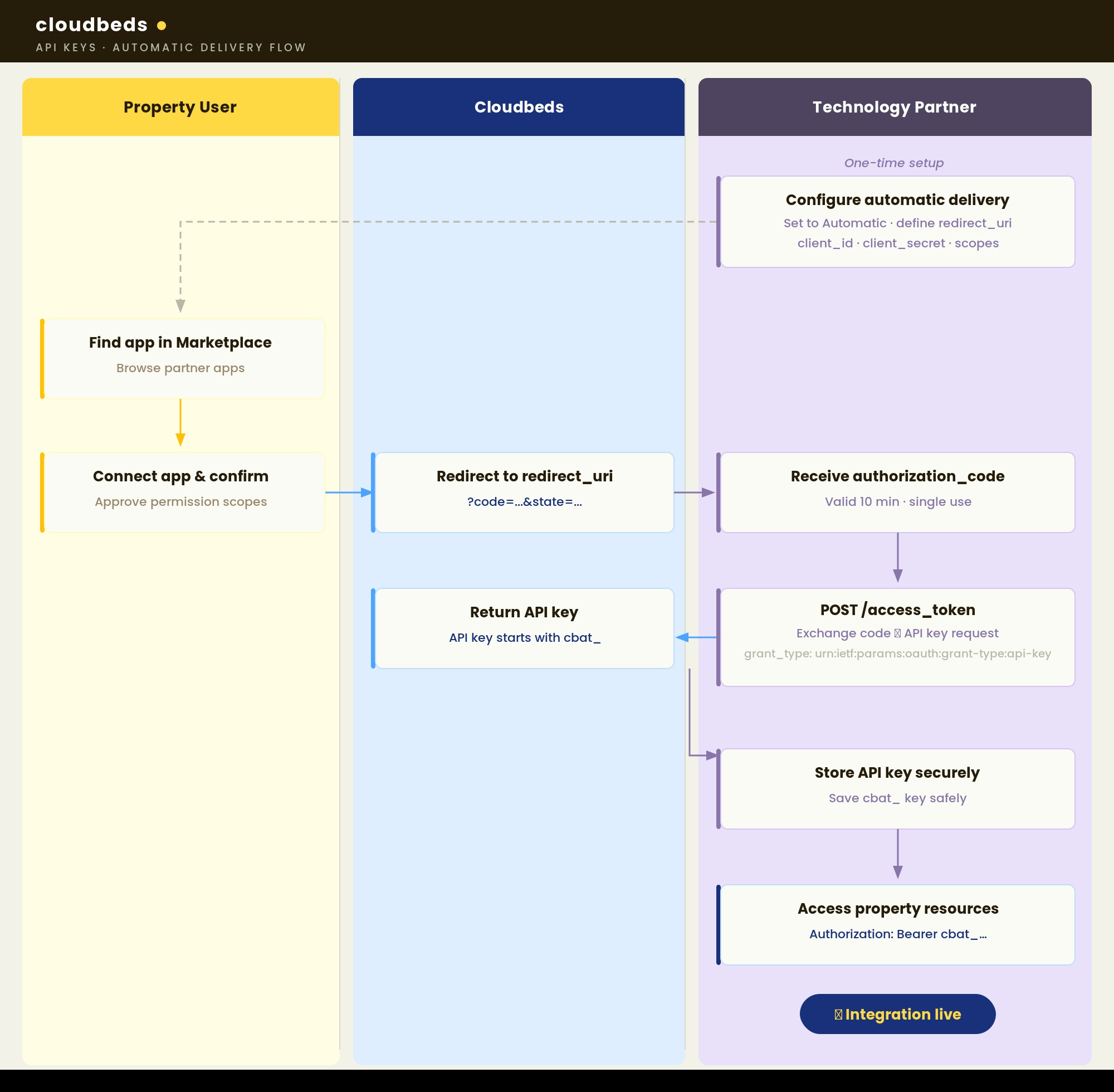 If you set the API Keys to automatic delivery, Cloudbeds will deliver an authorization_code to your predefined redirect URI when your app is connected by a property. This authorization code can be then exchanged for an API key.