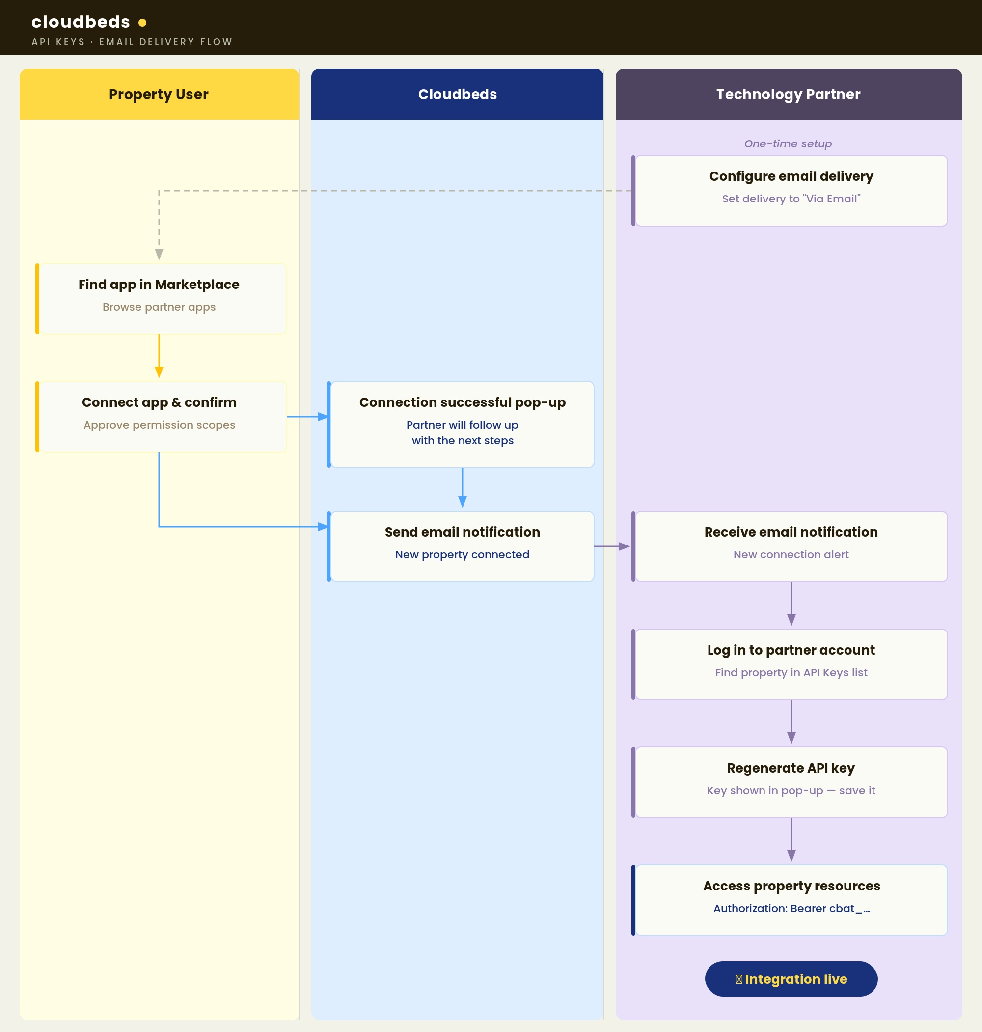 **It is strongly recommended to implement the API Keys automatic delivery method to automate the onboarding process from Cloudbeds Marketplace.**